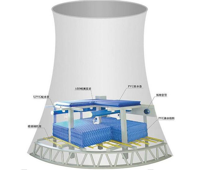 冷却塔高度一般为75~150米,底边直径65~120米。塔内上部为风筒,筒壁第一节(下环梁)以下为配水槽和淋水装置,统制为淋水构架,多用PE或PVC材料制成。塔底有一个蓄水池,但需根据蒸发量连续补水。淋水装置是使水蒸发散热的主要设备。运行时,水从配水槽向下流淋滴溅,空气从塔底侧面进入,与水充分接触后带着热量向上排出。冷却过程以蒸发散热为主,一小部分为对流散热。双曲线型冷却塔比水池式冷却构筑物占地面积小,布置紧凑,水量损失小,且冷却效果不受风力影响;它又比机力通风冷却塔维护简便,节约电能;但体形高大,施工复杂,造价较高,多用电动滑模。